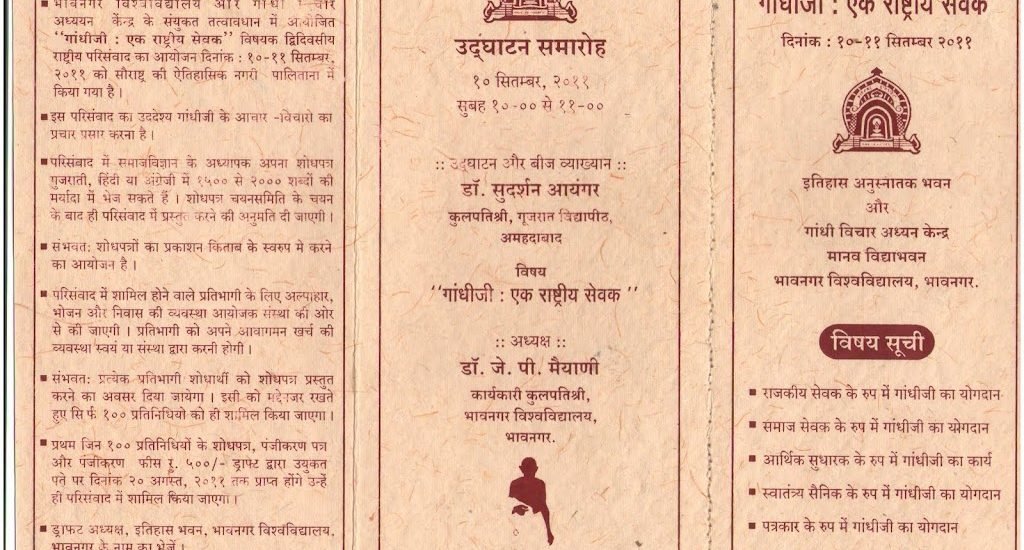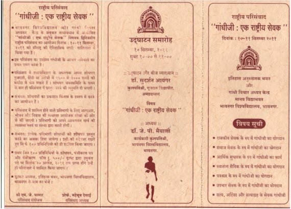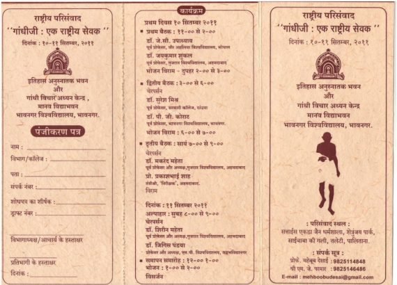 Organized National Seminar on “Gandhiji : As a National Servant” on 10, 11 September 2011 at Palinatan Dis. Bhavnagar. Invite all Lectures, Readers and Professors of Social Sciences of Colleges and Departments of University. For More details Contact  Prof. Mehboob Desai.  M. 09825114848