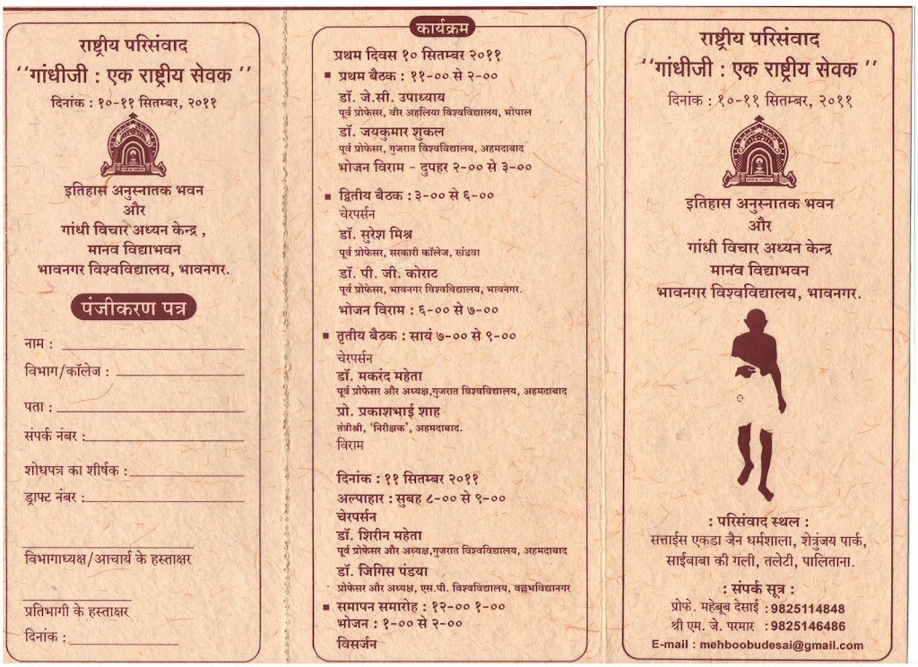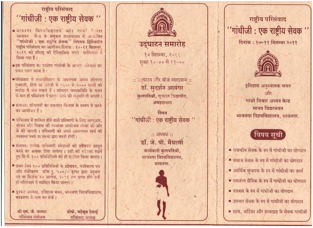 Organized National Seminar on “Gandhiji : As a National Servant” on 10, 11 September 2011 at Palinatan Dis. Bhavnagar. Invite all Lectures, Readers and Professors of Social Sciences of Colleges and Departments of University. For More details Contact  Prof. Mehboob Desai.  M. 09825114848